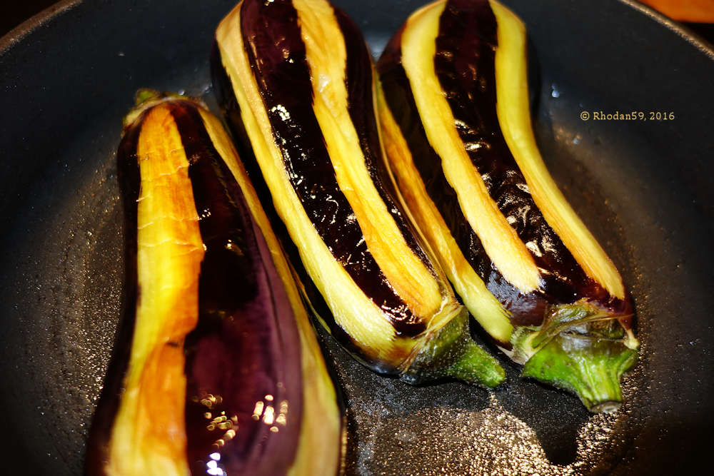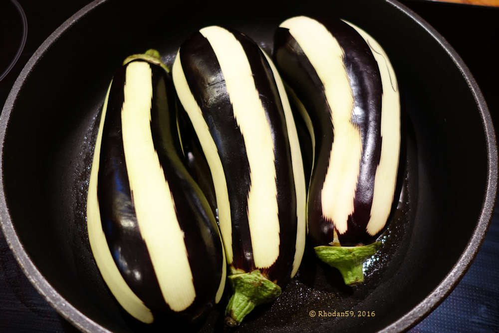 Die Auberginen werden natürlich erst mal gewaschen. Mit einem scharfen Messer kann man die Blätter abtrennen. Der Strunk sollte man stehen lassen. Mit einem Schäler werden die Auberginen der Länge nach streifenförmig geschält, so wie es auf dem Bild zu erkennen ist. Es muss auf jeden Fall genügend Schale übrig bleiben, damit die Auberginen in der Pfanne nicht zerfallen. Wenn die Streifen zu breit werden, dann nur an vier Seiten schälen.