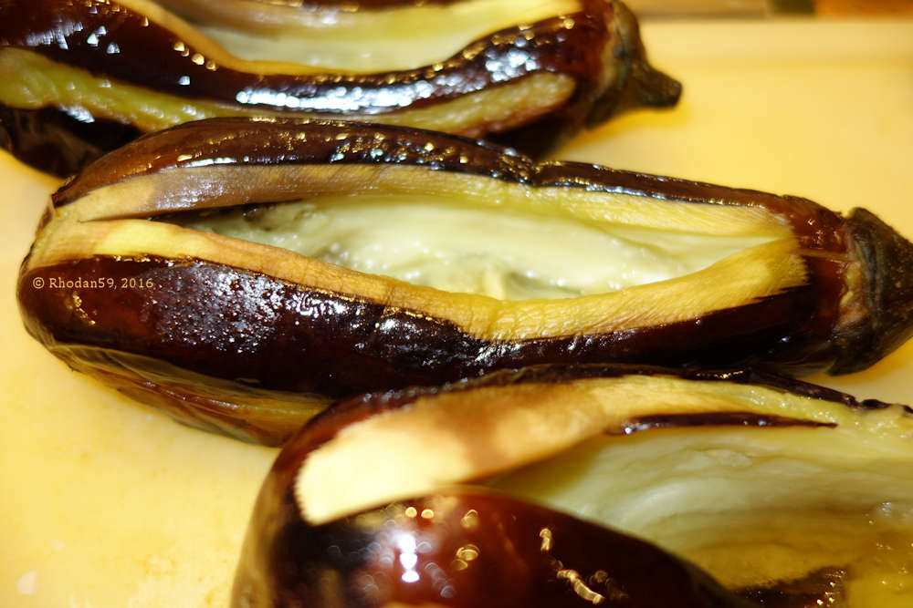 Liegen die Auberginen auf einem Teller, werden sie der Länge nach eingeschnitten, nicht durchschneiden. Mit zwei Löffeln wird das Fruchtfleisch der Auberginen so auseinander gedrück, dass eine Tasche entsteht, in die später das Hackfleisch eingefüllt wird.
