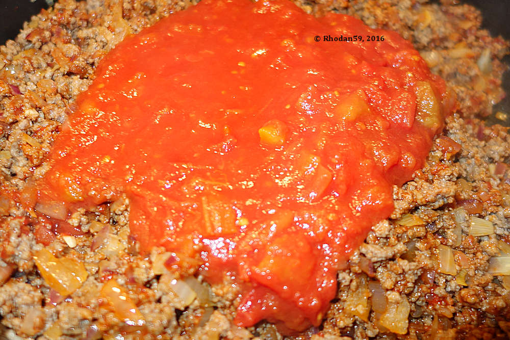 Das Hackfleisch wird nun in der Pfanne, in der der Saft von den Aubeginien zurückgeblieben ist gebraten. Auf jeden Fall permanent mit dem Kochlöffel das Hackfleisch bearbeiten, das es am Ende dann schön körnig ist. Da hat wohl jeder seine eigene Methode, bei er soll man auch bleiben. Ist das Hackfleisch fast nicht mehr rot, kommen die Zwiebel und der Knoblauch dazu. Das ganze weiter kochen, bis die Zwiebeln glasig werden. Nun geben wir das Tomatenmark dazu und vermischen es gut mit dem Hackfleisch. Die Packung mit den gestückelten Tomaten kippen wir in die Pfanne und vermischen das alles gut.