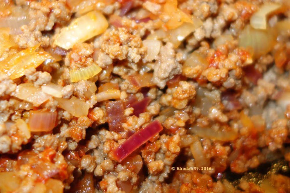 Die Mischung aus dem Hackfleisch, den Zwiebeln, dem Tomatenmark und der Tomaten wird langsam teigig. Jetzt ist der Zeitpunkt, die Herdplatte auf drei (bei Gas ist das wohl eins) zurück zu drehen und die restlichen Gewürze dazu zu geben. Das Salz und der Paprika sind noch kein Problem. Aufpassen sollte man aber mit dem Cayennepfeffer, denn je nach Herkunft kann der schon mal enorm scharf sein. Eine besondere Note verleiht der Zimt dem Gericht. Auch das ist es ratsam erst einmal mit einer kleineren Menge zu beginnen, um dann, je nach Geschmack noch mehr zuzugeben.